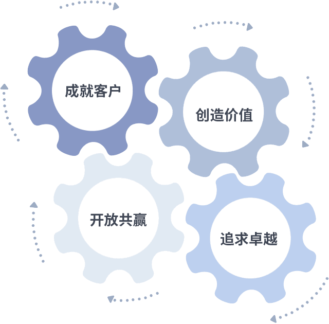 成就客户是一切决策的出发点,,,创造价值是衡量所有工作的标准,,,,追求卓越是我们做事做人的态度,,,开放共赢是我们的格局也是最终的结果。。价值观的齿轮环环相扣,,推动着组织里的每个人不断向前。。