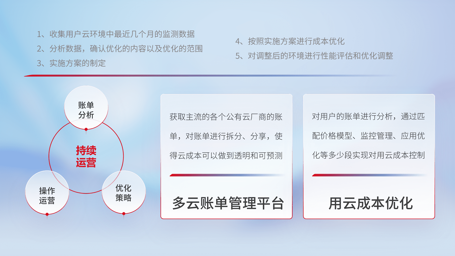 通过灵活运用多种自动化迁移工具,,帮助企业用户实现业务和数据高效 、、、稳定的上云迁移和云上迁移,,,采用自研多云纳管平台,,,以中立管理模式,,,,解决多组织、、、、多云、、、多运维厂商的复杂关系的管理,,,,保证多云平台资源配置的一致性,,,实时掌控云资源运行数据,,,运用智能化工具分析云资源多云平台的管理服务,,,透明化管理成本支出,,用云成本可预测、、用云费用可优化、、云资源配额有据可依。。。