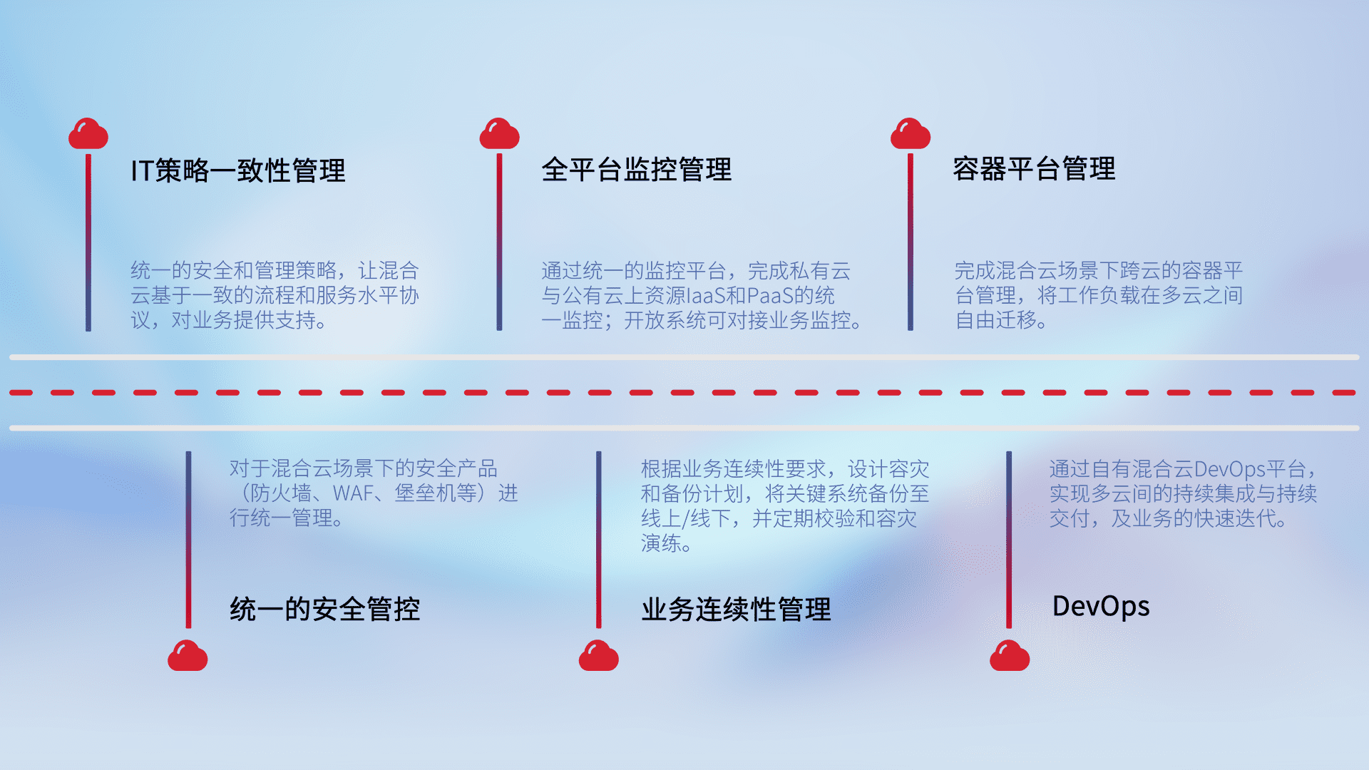 通过多云纳管,,,,以统一的资源数据模型把客户的云资源进行抽象和封装,,进而实现对多云资源的统一操作,,保障云资源管理的可靠性、、、稳定性与可用性。。量身定制化运维内容,,,配置、、、、开发运维、、、、补丁管理、、、备份、、、、监控、、、、认证和访问管理、、审计和日常巡检等,,保障在用云过程中的可靠度,,,稳定度以及高可用率。。