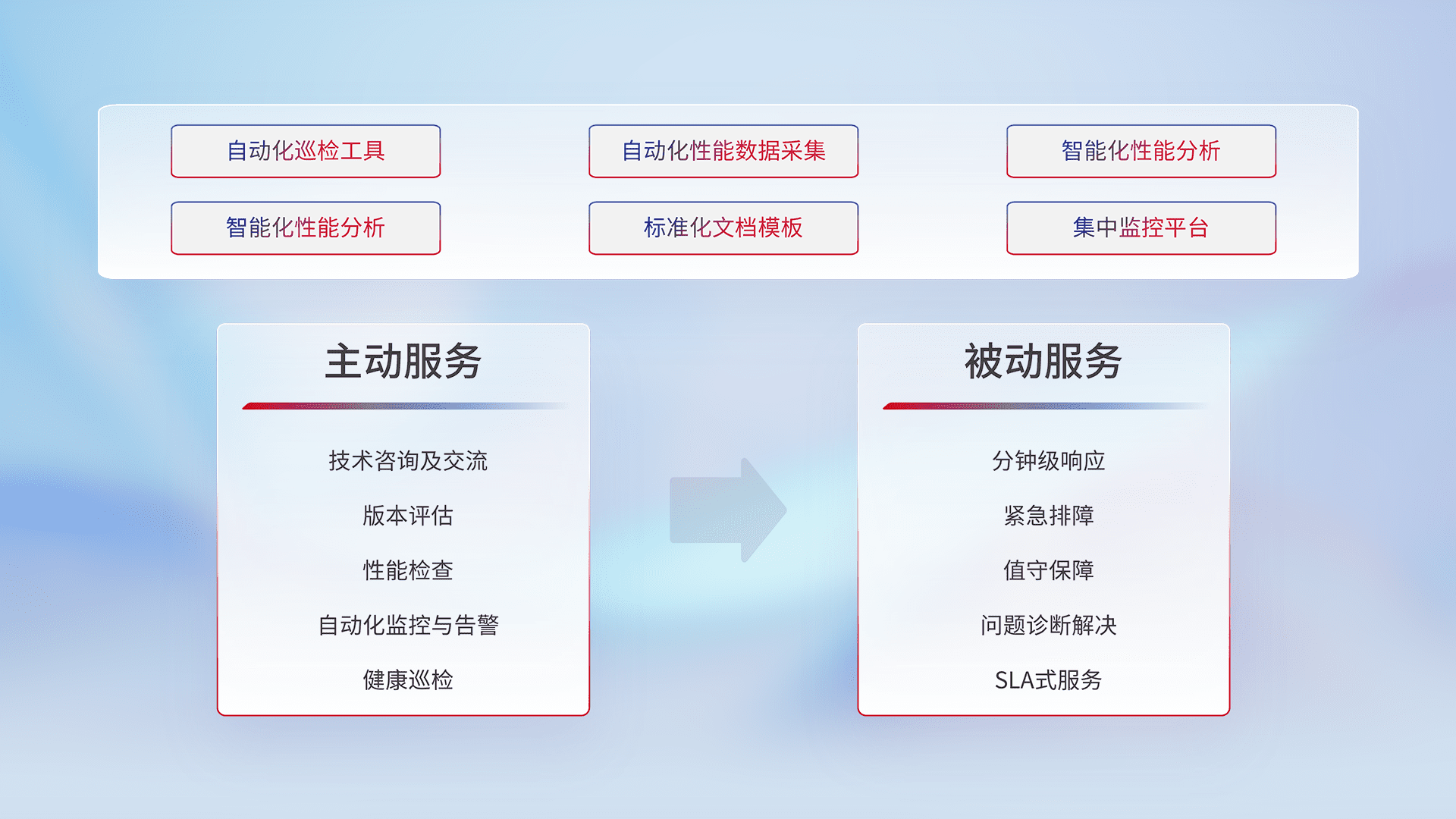 智能化工具和标准化文档,,,,保障服务质量,,提供主动服务(包含技术咨询、、版本评估、、性能检查、、、、自动化监控与告警、、、健康巡检)和被动服务包含(分钟级响应、、、紧急排障、、值守保障、、、、问题诊断解决、、SLA服务)。。